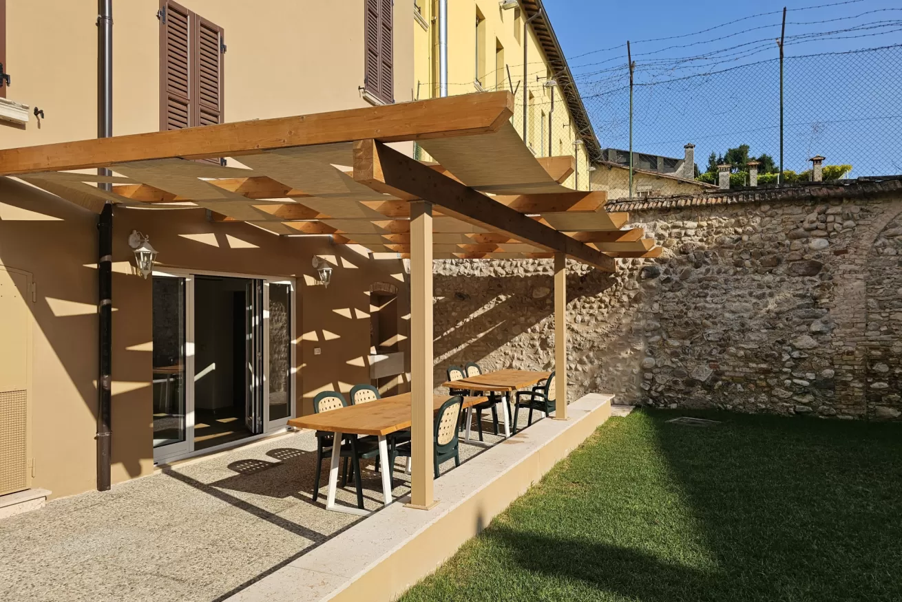 Al piano basso troviamo un ampio giardino condomiale,comune a tutti e tre gli appartamenti,dotato di tavoli per pranzare/cenare fuori,zona con prato e sdraio dove potersi risposare,zona BBQ in muratura.