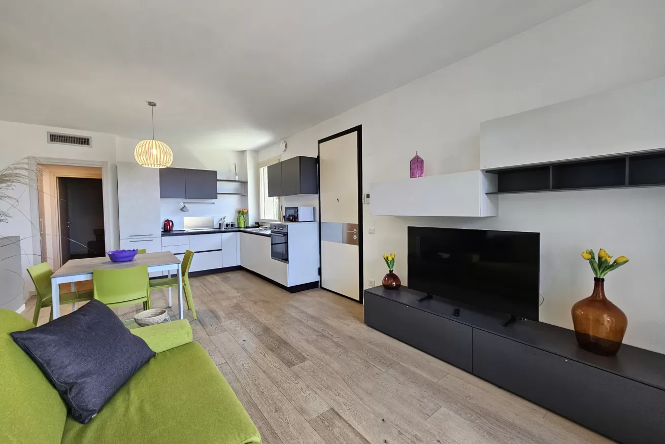 Appartamento trilocale disposto su due livelli ;al piano terra una camera da letto matrimoniale,un bagnio con doccia,ampia zona living con cucina moderna,tv,divano letto al piano inferiore troviamo altro bagno bagno con doccia e lavatrice.